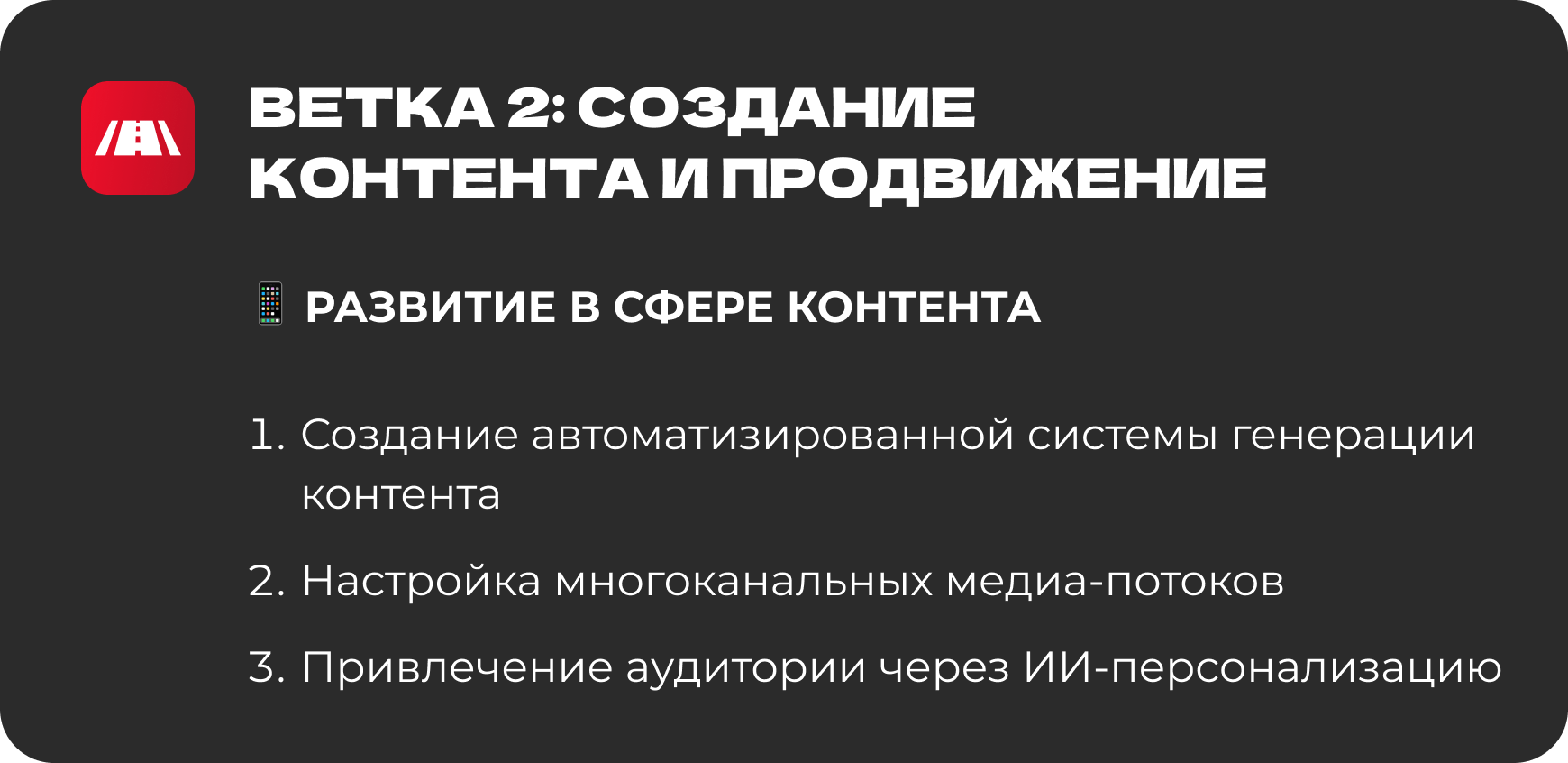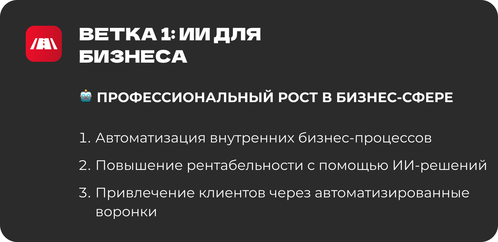 Эта структура показывает две четкие траектории развития: одна для предпринимателей, фокусирующихся на оптимизации бизнеса с помощью ИИ, вторая для специалистов по контенту и SMM. Обе ветки начинаются с общих базовых навыков и ведут к высокому доходу, но через разные специализации.