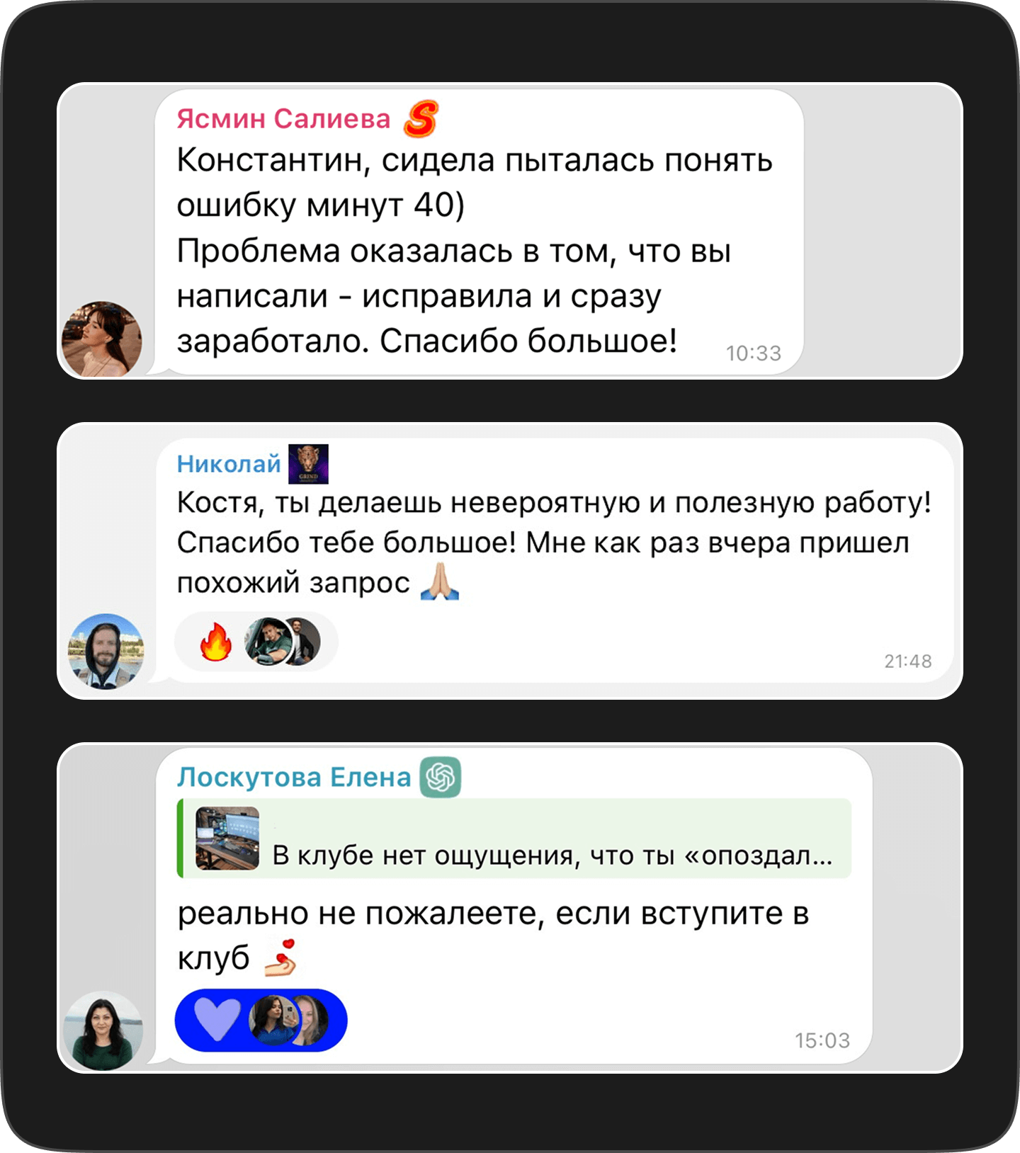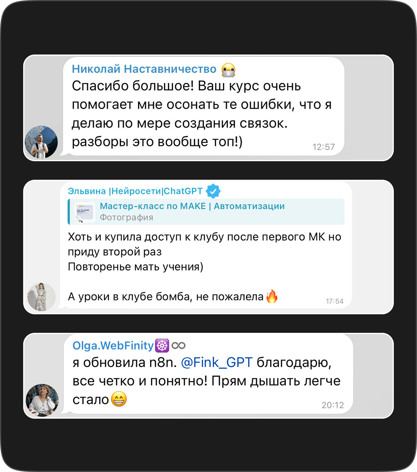 Соединяем всё: Telegram, Instagram, YouTube, Airtable, Google Таблицы, WordPress, CRM, Supabase и десятки других платформ. Настраиваем обмен данными между ними.
