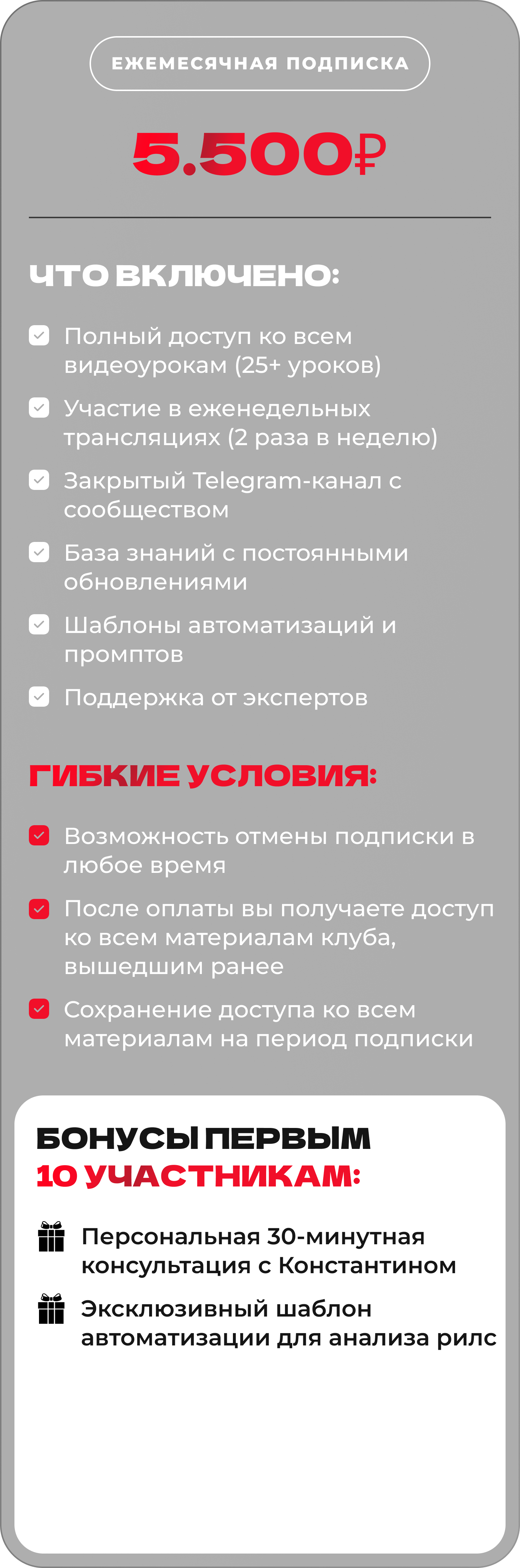 Встроенные ИИ-инструменты: ChatGPT, Claude, Midjourney, Eleven Labs и другие. Используем для генерации контента, анализа, озвучки и автосценариев.